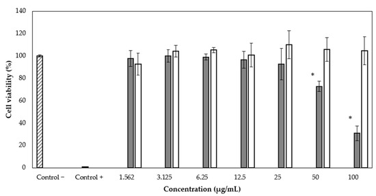 Cytotoxic effect of rBmK-AGAP on the MCF-7 cell line. Viability percentages were determined by the cytotoxicity test using the WST-1 reagent. rBmK-AGAP (gray bar) and SmbP_BmK-AGAP (white bar). * ANOVA considered a value of p < 0.05 statistically significant vs. the negative control.