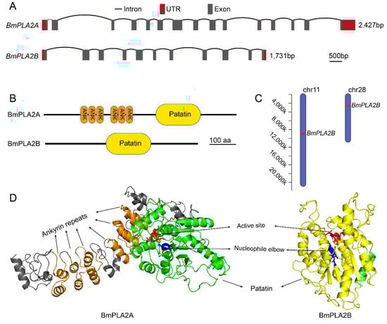 In order to identify the genes of interest in the silkworm, B. mori genome, we performed multiple sequence searches using BLAST analysis at the National Center for Biotechnology Information (NCBI) database. By conducting multiple searches, we found two PLA2 sequences from the B. mori, which were identified and named as BmiPLA2A and BmiPLA2B. The obtained sequences were confirmed by using PCR cloning and sequencing. The BmiPLA2A included a 2427 base-pair open reading frame (ORF) (Figure S1) that encoded 808 amino acid residues. BmiPLA2B, on the other hand, comprised 1731 bp (Figure S2), which encoded a protein of 576 amino acids. BmiPLA2A protein has a molecular weight of 88.02 kDa and a theoretical pI of 6.59. The BmiPLA2B protein comprises a molecular weight of 63.87 kDa and a theoretical pI of 9.64. In addition, both of these genes are located on different chromosomes and have distinct gene architectures. BmiPLA2A is located on chromosome 11 in the silkworm genome, with 15 exons and 14 introns, whereas BmiPLA2B is located on chromosome 28, with 11 exons and 10 introns (Figure 1). They have certain similarities in amino acid sequences, including patatin domain, motifs of nucleophile elbow, and active site (Figure 1B,D, Figures S1 and S2). While BmiPLA2B shares several characteristics with BmiPLA2A, BmiPLA2B does not contain ankyrin repeats, which are composed of six ANK domains.