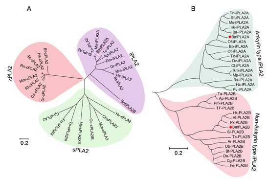Evolutionary analysis showed that PLA2s formed three separate branches, including cPLA2, sPLA2, and iPLA2, with BmiPLA2A and BmiPLA2B forming a distinct clade with the iPLA2 group (Figure 3A). Another phylogenetic tree was constructed to further understand the evolutionary differences between BmiPLA2A and BmiPLA2B. Interestingly, according to the presence of the N-terminal ankyrin repeat domain, iPLA2 is divided into two distinct branches, which is a unique feature of this gene. BmiPLA2A was separated into ankyrin type, and BmiPLA2B was separated into non-ankyrin type (Figure 3B).