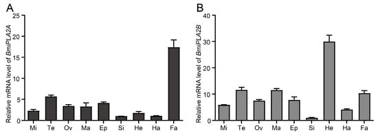 Tissue distribution of BmiPLA2A (A) and BmiPLA2B (B). Si: silk gland, Ma: Malpighian tube, Ep: epidermis, Fa: fat body, He: head, Te: testis, Mi: midgut, and Ha: hemocyte, and Ov: Ovary. The expression levels in the silk gland were used as the calibrator for each group.