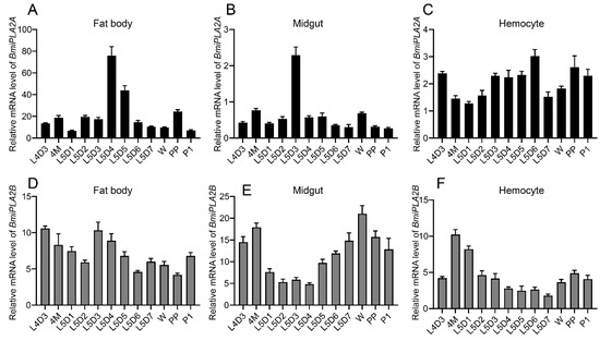 In order to investigate the temporal expression profiles of BmiPLA2A and BmiPLA2B, fat body, midgut, and hemocytes from larvae at fourth instar day one through pupae were collected. The results revealed that the mRNA expression of BmiPLA2A and BmiPLA2B had different expression patterns on the tested B. mori stages (Figure 5). This inconsistency was evident since the expression of BmiPLA2A was much higher in fat bodies when compared to the expression of BmiPLA2B (Figure 5A,D). In the fat body, BmiPLA2A had the maximum expression levels at the fifth instar at 4 days, and then the expression levels gradually decreased, reaching the lowest levels at the wandering stage. BmiPLA2B had comparably low expression levels at L5D2 and L5D6 to the pre-pupa stage. In the midgut, BmiPLA2A had a moderate expression peak during the fourth molting stage and wandering stage, and the highest expression level appeared at L5D3; the expression level of BmiPLA2B showed a decrease-to-increase trend with the highest mRNA levels appearing at the fourth molting stage and wandering stage (Figure 5B,E). In the hemocytes, BmiPLA2A showed relatively low expression levels near the fourth molting and wandering stages, whereas BmiPLA2B had the highest transcription level in the fourth molting stage and a moderate peak level at the pre-pupa stage (Figure 5C,F).