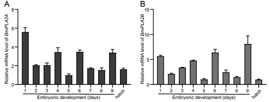 In addition, total RNA was isolated from embryonic developmental stages and hatch day to analyze the embryonic developmental profile of BmiPLA2s, and then total RNA was reverse transcribed into cDNA. The results of qRT-PCR showed that the expression levels of BmiPLA2A and BmiPLA2B followed mRNA expression patterns that were quite similar. Furthermore, we observed that BmiPLA2s mRNA levels were at their peak in the middle stages of embryonic development (Figure 6).