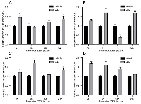 In order to examine the expression patterns of BmiPLA2s response to ecdysone, silkworm larvae were administrated with 20-hydroxyecdysone, a steroid hormone. The results revealed that 20-hydroxyecdysone significantly increased the expression level of BmiPLA2s in general (Figure 7). In both hemocytes (Figure 7A) and the epidermis (Figure 7B), BmiPLA2A mRNA levels induced by 20-hydroxyecdysone showed an upward-downward-upward trend, and the mRNA level of BmiPLA2A at 12 h was significantly decreased by 20-hydroxyecdysone in the epidermis (Figure 7B). The transcription levels of BmiPLA2B in hemocyte and epidermis gradually increased and then declined after exposure to 20-hydroxyecdysone treatment, with peak levels observed at 6 h in hemocytes and 3 h in the epidermis (Figure 7C,D).