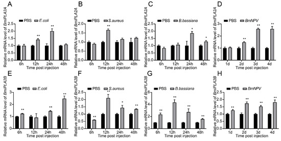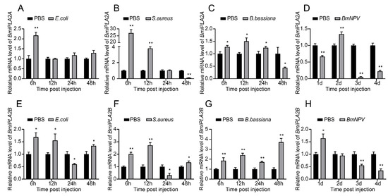 We performed a qRT-PCR assay to determine relative expression patterns of BmiPLA2s in two immune-related tissues (hemocyte and fat body) after infection with E. coli, S. aureus, B. bassiana, or BmNPV. As shown in Figure 8 and Figure 9, the mRNA expression levels of BmiPLA2s were significantly changed with different degrees in response to immunological stress. Furthermore, BmiPLA2s expression levels in hemocytes and fat bodies varied with the type of pathogen used, and the maximum expression level induced differed at different time points in the examined tissues. When larvae were exposed to immunological challenges involving E. coli, S. aureus, or B. bassiana, the expression levels gradually or sharply increased at first and then decreased to some extent. Of note, when exposed to E. coli infection, the expression levels of BmiPLA2A in the fat body increased dramatically at 3 h post-infection and then returned to normal after that (Figure 9A), while the expression levels of BmiPLA2B continuously increased and reached a peak at 48 h (Figure 8E). Moreover, among the four tested pathogens, S. aureus strongly induced the transcription levels of BmiPLA2A in the fat body. However, although BmNPV stimulation increased mRNA levels of BmiPLA2A and BmiPLA2B in hemocytes (Figure 8D,H) and in the fat body, BmNPV mediated immune stress significantly increased the expression levels of BmiPLA2A and BmiPLA2B in the first two days and dropped down lower than normal levels in the following time (Figure 9D,H).