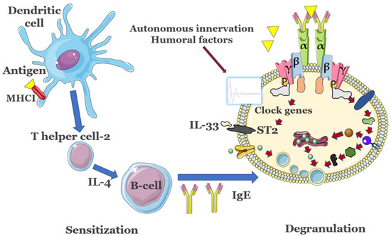 Key immune response events associated with the presence of allergens. Antigens are presented by major histocompatibility complex (MHC) class I molecules residing on membranes of dendritic cells (DCs) and, among other effects such as proliferation of antigen-specific cytotoxic CD4+ T helper cells, also lead to the production of innate cytokines. The latter modulate the changes in phenotype of DCs, promote development of T helper cells 2 (Th2) and will activate MCs and basophils. B cells promote IgE release after stimulation from TH2. In MCs, clock genes are modulated by a series of Zeitgebers to control the expression of suppressor of tumorigenicity 2 (ST2) or of FcεRIβ, modulating the allergic response. Importantly, activity of T cells and B cells is also controlled by their own internal circadian clocks. The detailed activation of mast cells is presented in Figure 1. Figure not to scale.