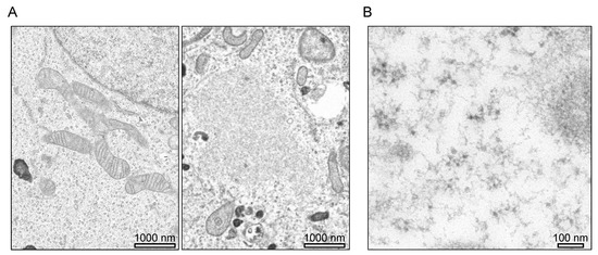 First, we showed an example of the detection of mitochondria-derived cytoplasmic DNA in HeLa cells in which the TFAM protein was knocked down by siRNA (Figure 1A). TFAM is a key mitochondrial transcription factor and also functions in mitochondrial DNA replication and repair [20]. Sequence polymorphisms in this gene are reported to be associated with Parkinson’s disease [21,22]. After 3 days of TFAM protein knockdown, a lot of double-stranded DNA dots were detected in the cytoplasm of the HeLa cells. Histones are positive markers for nuclear-origin DNA in the cytoplasm, and negative markers for mitochondrial DNA and mitochondrial-origin DNA in the cytoplasm [23]. These dots did not co-localize with histones, suggesting that they were not nuclear-derived DNA. Furthermore, some of these cytoplasmic, ectopic DNA dots did not co-localize with Hsp60, a marker for the mitochondrial matrix, indicating that they resided outside the mitochondria (Figure 1B,C). Electron microscopy also showed that the ectopic DNA leaked from the mitochondria (Figure 2A,B). In summary, the increase in ectopic DNA dots in the cytoplasm by TFAM knockdown was due to mitochondrial DNA leaking from the mitochondria.
