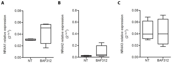 Based on our previous results regarding FTY720 [10], we treated primary cultures of PBMCs extracted from human buffy coats with BAF312 to explore its effect on NR4A gene expression. Here, we observed that 24 h of in vitro stimulation with BAF312 is not able to modulate the expression level of NR4A (Figure 1A, t-test p = 0.249; Figure 1B, t-test p = 0.200; Figure 1C, t-test p = 0.898).