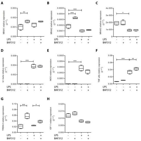 BAF312 up-regulates NR4A1, NR4A2, and TREM-2 expression in the N9 microglial cell line. Gene expression levels of NR4A1 (A), NR4A2 (B), NR4A3 (C), IL 1-beta (D), iNOS (E), TNF-alfa (F), TREM-2 (G), and IGF-1 (H) in N9 murine microglial cell line. Comparison of gene expression levels between not-treated (n = 4), BAF312 (n = 4), LPS (n = 4), and BAF312/LPS (n = 4) -stimulated cells. One-way ANOVA followed by Tukey’s HSD post hoc test for (A,B,D–H), and Kruskal-Wallis followed by Dunn’s post hoc test for (C). * 0.05 > p value ≥ 0.01; ** 0.01 > p value ≥ 0.001; *** p value < 0.001.