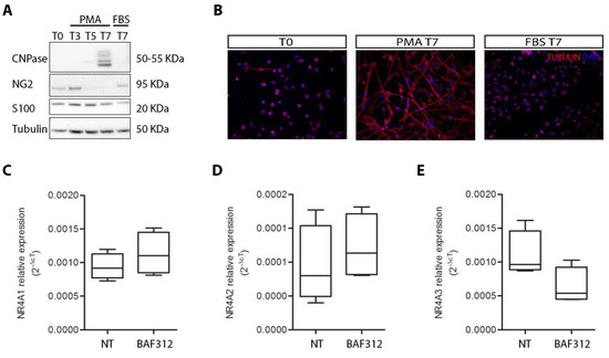 To evaluate whether the pro-myelination and neuro-protective effects of BAF312 could involve the modulation of NR4A in oligodendrocytes, we differentiated MO3.13 oligodendrocyte precursors into oligodendrocytes and treated them with BAF312. We first evaluated the cell differentiation state by Western blot (Figure 3A) and immunofluorescence (Figure 3B) analysis. After 7 days of culture in differentiation medium (PMA T7), the levels of the oligodendrocyte marker 20,30-cyclicnucleotide-30-phosphodiesterase (CNPase) increased (Figure 3A), while the expression of the astrocyte marker calcium-binding protein S100, as well as the oligodendrocyte precursor cell marker neural/glial antigen 2 (NG2), decreased (Figure 3A), supporting the achievement of a more mature oligodendrocyte state. On the other hand, when MO3.13 progenitor cells were cultured for 7 days in the presence of 10% FBS, but in the absence of PMA (FBS T7), S100 and NG2 were still detectable, while CNPase was undetectable (Figure 3A). The differentiation state of oligodendrocytes was also supported by the achievement of a branched morphology, which only characterized MO3.13 cells cultured in the differentiation medium (PMA T7) (Figure 3B). Finally, we analyzed the expression levels of the NR4A genes in PMA T7 MO3.13 oligodendrocytes, and we observed for the first time that they were expressed in the mature oligodendrocyte cell line. However, treatment with BAF312 did not modulate the expression levels of the NR4A genes (Figure 3C t-test p = 0.337, Figure 3D t-test p = 0.490 and Figure 3E t-test p = 0.081).