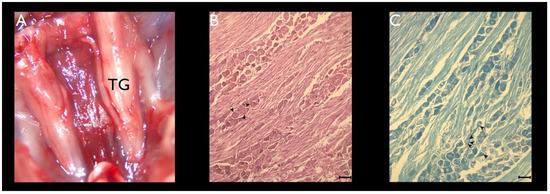 Dissection of the TG and histological characterization of TGCs. (A) Macroscopic aspect of the right and left TGs after the dissection of the skullcap, the skin (along with the subcutaneous tissue), and the brain (superior view). (B) Optical microscopy of a TG section stained with H&E, captured under 40× magnification. (C) Optical microscopy of a TG section stained with LFB, captured under 40× magnification. Arrowheads (B,C) represent SGCs. Scale bars (B,C) represent 100 µm.