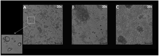 Phase-contrast microscopy of primary cultures of TG after 4 h (A), 24 h (B), and 48 h (C). Within the first four hours, a close relationship between the SGCs and the cell bodies of neurons was detected. This relationship was highlighted in the white square on the left side of Figure 1A (a 3.0 zoom was adopted for better visualization). After 24 h, the majority of the cultured TG SGCs adopted a fusiform shape. (B): arrows indicate neurons, arrowheads indicate SGCs. After 48 h, they migrated away from the neurons to which they were originally related and arranged themselves in parallel bundles. Scale bars represent 50 µm.