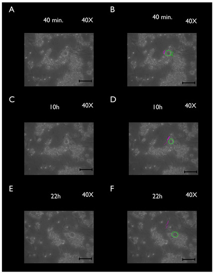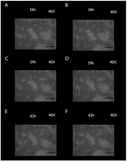 Time-lapse frames of cultured TGCs at 56, 59, and 62 h (40× magnification). SGCs continue to migrate away from neurons and develop a clear fusiform aspect (A,C,E). SGCs are highlighted (pink, B,D,F). Scale bars represent 100 µm.