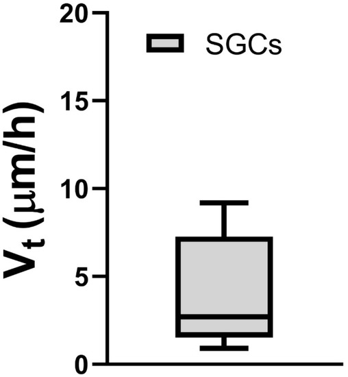 Cultured TGCs were then evaluated at the following timepoints: 4, 24, and 48 h. Upon phase-contrast microscopy and SEM evaluation, the following short-term morphological changes were found in cultured TGCs: within the first 4 h, each TG neuron exhibited a round shape with a relatively large size, whereas the SCGs were clearly smaller, were also round-shaped, and were in close contact with the analyzed TG neurons (Figure 2A and Figure 3A–C). After 24 h, cultured TG neurons developed long and thin processes, while each SGC showed a flattened and fusiform shape. At this point, the SGCs were found at short distances from the neurons (Figure 2B and Figure 4A–C). After 48 h, neurons kept their elongated and thin processes, while the SGCs migrated away from those neurons. At this stage, the SGCs maintained a fusiform shape. In addition, some of those cells were arranged in parallel bundles (Figure 2C and Figure 5A–C). Similar changes were confirmed by time-lapse photography (Figure 6 and Figure 7). In addition, a videomicroscopy analysis allowed for a quantitative determination of the migration velocity of the SGCs (4.23 ± 0.72 µm/h) (Figure 8).