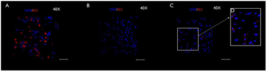 Anti-SK3 immunocytochemistry carried out in cultured TGCs (40× magnification), after 4 h (A), 24 h (B), and 48 h (C). SK3 was represented in red, while the nuclei (immunostained with DAPI) were depicted in blue. The expression of SK3 changed over time. Hence, it was more intense in the early 4 h, decreasing with 24 h, and rising again around 48 h. At this last point, SK3 was presumably concentrated in SGCs. The white square (D) shows a cluster of SGCs (a 1.5 zoom was adopted for better visualization). Scale bars represent 50 µm. CTCF = corrected total cell fluorescence.