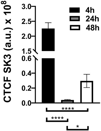 A bar graph (mean ± standard error) was used to represent the SK3 fluorescence quantification timepoints. Data were analyzed using the GraphPad Prism statistics software 8.1 (GraphPad Software, Inc., La Jolla, CA, USA). A one-way ANOVA, followed by Tukey’s test, was used for comparisons between each situation, where * means p < 0.05 and **** means p < 0.0001. The p-values and other numbers are provided in the figure legends.