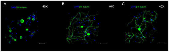 For immunocytochemistry with the primary antibody rabbit anti-βIII-tubulin (Abcam, Cambridge, UK), the coverslips were first permeabilized with 0.2% Triton X-100 for 5 min at room temperature, and they were then blocked with 5% bovine serum albumin (Sigma-Aldrich, St. Louis, MO, USA) for 1 h. The rabbit anti-βIII-tubulin antibody was then added to the blocking buffer at a 1:100 dilution and was incubated overnight at 4 °C. After incubation with the primary antibody, the coverslips were washed with PBS and were then incubated with the secondary antibody, the goat anti-rabbit Alexa Fluor 488 (1:400) (Molecular Probes ™, Eugene, OR, USA), at room temperature for 1 h [37].