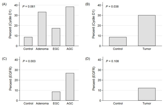 The expression patterns of each biomarker are presented in Figure 1, which revealed that EGFR expression increased with the progression of carcinogenesis and the advancement of malignancy, whereas cyclin D1 expression was increased in all tumorous tissues (adenoma, EGC, and AGC) compared to normal tissues and did not increase with advancement from EGC to AGC. The positive expression rates of cyclin D1 were 8.7% (2/23), 33.3% (8/24), 17.4% (4/23), and 38.5% (10/26) in the control tissue, adenoma, EGC, and AGC, respectively (p = 0.061). In the tumor group (adenoma, EGC, and AGC), the positive expression rate of cyclin D1 was high compared to the control group (non-tumorous tissue) (30.1% (22/73) vs. 8.7% (2/23), p = 0.038). The positive expression rates of EGFR were 0%, 0%, 8.7% (2/23), and 26.9% (7/26) in the control tissue, adenoma, EGC, and AGC, respectively (p = 0.003). These findings indicate that EGFR expression positivity increased as the gastric tissue became malignant and that cyclin D1 expression positivity was increased in all of the tumorous tissues.
