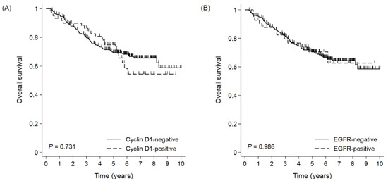 The expression levels of each biomarker were determined by immunohistochemical (IHC) staining of tissue microarray (TMA) sections. A 2 mm diameter core tissue in each case was arrayed in a new recipient paraffin block. The TMA section of each slide was then deparaffinized, rehydrated, and incubated in 3% H2O2 to prevent non-specific background staining. After heating in a microwave oven at 700 W for 20 min with 10 mmol/L citrate buffer (pH 6.0) and incubating for 10 min with Ultra V Block (Lab Vision, Fremont, CA, USA) at room temperature, slides were incubated for 32 and 44 min with primary monoclonal antibodies specific to Cyclin D1 and EGFR, respectively. The BenchMark XT (VENTANA, Tucson, AZ, USA) was used for IHC staining. The expression level of the biomarkers was scored and interpreted by two pathologists blind to the patients’ clinical data as follows: negative (<1% of tumor cells were stained) and positive (≥1% of tumor cells were stained; 1+ (1–20%), 2+ (21–50%), and 3+ (>50%)) (Figure S1, see Supplementary Materials).