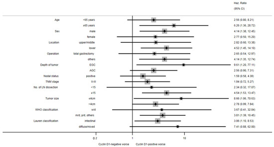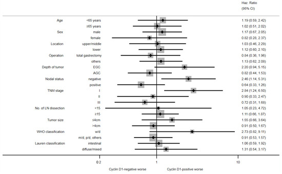 The median follow-up duration was 73 months. In the whole cohort, the median OS was not reached, and the 5- and 10-YSRs were 70.4% and 58.7%, respectively. When survival was compared according to the expression of each biomarker, there were no differences in the OS between the negative and positive expression groups for each biomarker (Figure 2). In subgroup analyses, the cyclin D1-positive group had shorter survival than the cyclin D1-negative group in stage I GC (Figure 3). The 5- and 10-YSRs were 89.8% and 86.5% in the cyclin D1-negative group and 84.4% and 62.8% in the cyclin D1-positive group in stage I GC, respectively (p = 0.010, Figure 3C). In EGC, the cyclin D1-negative group had better survival than cyclin D1-positive with borderline statistical significance (p = 0.062, Figure 3A), but not in AGC (p = 0.541, Figure 3E). However, the EGFR positivity did not affect the survival in any subgroup (Figure 3B,D,F). On a forest plot, the cyclin D1-positive group showed a poor prognosis compared to the cyclin D1-negative group in stage I and in node-negative disease (Figure 4). Upon multivariate analysis in stage I GC, cyclin D1 positivity was an independent poor prognostic factor (hazard ratio (HR) 2.801, 95% confidence interval (CI) 1.221–6.426, p = 0.015, Table 2)).