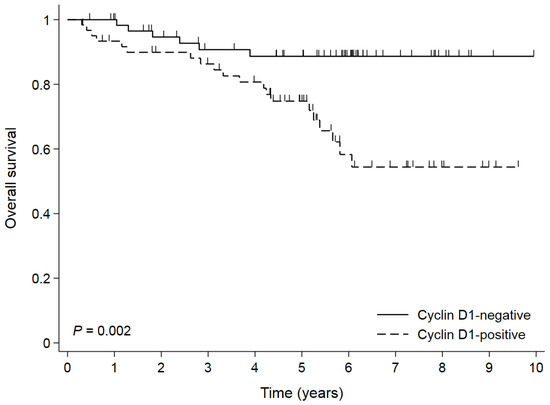 Overall survival by cyclin D1 positivity in propensity score-matched cohort.