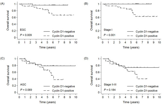 Overall survival by cyclin D1 in (A) EGC, (B) stage I gastric cancer, (C) AGC, and (D) stage II-III gastric cancer in propensity score-matched cohort. EGC: early gastric cancer; AGC: advanced gastric cancer.
