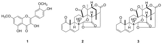 Structures of compounds 1–3 isolated from P. alkekengi var. franchetii, 3′,7-dimethylquercetin (1), physalin B (2), and isophysalin B (3).