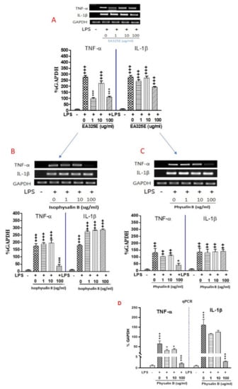 Effects of isolated compounds from ethanol extract in lipopolysaccharide (LPS) stimulated RAW 264.7 cells. Data represent means ± SEM. ++ p < 0.01, +++ p < 0.001 compared to control, * p < 0.05, *** p < 0.001 compared to LPS. Treatment of RAW 264.7 cells with LPS alone resulted in significant increases in pro-inflammatory cytokines (TNF-α and IL-1β) and mRNA levels as compared to the control group. With EA325E (A), Isophysalin B (B), and physalin B (C) treatment, there was a markedly decrease in the mRNA expression levels of TNF-α in LPS stimulated raw 264.7. (D) mRNA expression was determined with q-PCR.
