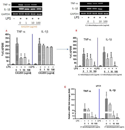 Effects of isolated compounds from hexane extract in lipopolysaccharide (LPS) stimulated RAW 264.7 cells. Data represent means ± SEM. + p < 0.05, +++ p < 0.001 compared to control, ** p < 0.01, *** p < 0.001 compared to LPS. Treatment of RAW 264.7 cells with LPS alone resulted in significant increases in pro-inflammatory cytokines (TNF-α and IL-1β) and mRNA levels as compared to the control group. However, the expression of TNF-α and IL-1β mRNA levels in EA325H (A) and 3′,7-dimethylquercetin (B) treated group showed a dose-dependent decrease as compared to the LPS group. (C) mRNA expression was determined with q-PCR.