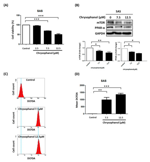 Effect of chrysophanol on cell survival, mTOR/PPAR-α expression, and ROS production in SAS cells. (A) WST-1 was used to measure viability of cells in indicated groups. (B) Upper panel indicates expression changes of mTOR and PPAR-α proteins in the presence of 0, 7.5, and 12.5 μM chrysophanol. Lower panel indicates quantitative results of assessing specific proteins using ImageJ. (C) Changes in ROS levels (with 10 μM DEFDA staining) with 0 (control), 7.5, and 12.5 μM chrysophanol treatment. (D) Mean fluorescence intensity was used to measure lipid ROS levels. Three independent replicates were used to calculate standard deviation; n = 3. * p < 0.05; ** p < 0.01; *** p < 0.001.