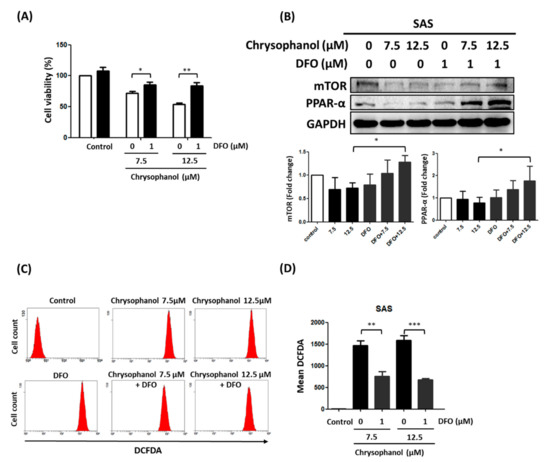 In our previous study, we proposed that chrysophanol-based therapy may decrease oral cancer progression by activating ferroptosis [19]; however, the effect of DFO on the regulation of cell death, mTOR/PPAR-α expression, and ROS accumulation in chrysophanol-treated SAS cells is poorly understood. The results of this study show that 1 μM DFO significantly alleviated the decrease in cell viability in the presence of 12.5 μM chrysophanol, but slightly reversed it in 7.5 μM chrysophanol (Figure 2A). Moreover, 1 μM DFO reversed the downregulation of mTOR and PPAR-α in 12.5 μM chrysophanol, but 7.5 μM chrysophanol slightly reversed it (Figure 2B). Interestingly, 1 μM DFO significantly attenuated chrysophanol-induced ROS accumulation at both 7.5 and 12.5 μM (Figure 2C,D).