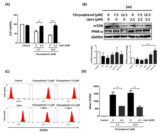 Effect of Lipro on cell survival, mTOR/PPAR-α expression, and ROS production in chrysophanol-treated SAS cells. (A) WST-1 was used to measure viability of cells in indicated groups. (B) Upper panel indicates expression changes of mTOR and PPAR-α proteins in the presence of 0, 7.5, and 12.5 μM chrysophanol with (2.5 μM) or without Lipro treatment. Lower panel indicates quantitative results of assessing specific proteins using ImageJ. (C) Changes in ROS levels (with 10 μM DEFDA staining) with 0 (control), 7.5, and 12.5 μM chrysophanol treatment with (2.5 μM) or without Lipro treatment. (D) Mean fluorescence intensity was used to measure lipid ROS levels. Three independent replicates were used to calculate standard deviation; n = 3. ** p < 0.01; *** p < 0.001.