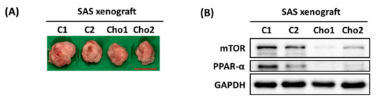 Effect of chrysophanol on SAS-xenograft mouse model. (A) Photos show tumors excised after sacrifice on day 30. (B) Changes in mTOR and PPAR-α expression in tumors from BALB/cAnN.Cg-Foxn1nu/CrlNarl mice from two groups: control (saline) and chrysophanol 1.67 mg/kg 3 times per week for 4 weeks. C1 and C2 indicate independent mice injected with 5 × 106 cells without chrysophanol treatment (n = 2). Cho1 and Cho2 indicate independent mice injected with 5 × 106 cells with 1.67 mg/kg chrysophanol treatment (n = 2). Scale bar = 2.5 cm.