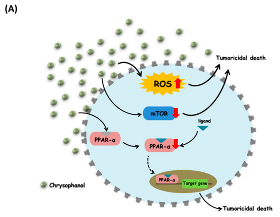 These results show that chrysophanol inhibits the growth of oral squamous cell carcinoma cells by modulating mTOR/PPAR-α and ROS accumulation. Iron is thought to play an important role in this process (Figure 5). This study provides a new drug candidate for OSCC treatment. However, even though chrysophanol was able to inhibit tumor cell growth in a cell model, its protective mechanism in vivo needs to be further explored.