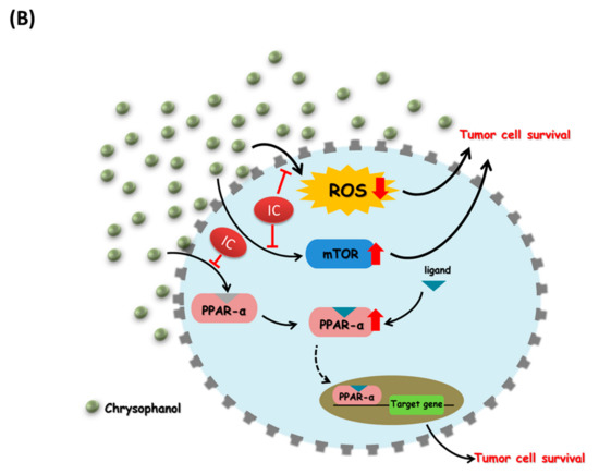 Schematic diagram of chrysophanol and its role in regulating tumoricidal death in SAS cells. (A) Chrysophanol-induced tumoricidal death via increased ROS accumulation and decreased mTOR/PPAR-α expression. (B) Iron chelator (IC; DFO and Lipro were used in this study) attenuated chrysophanol-induced tumoricidal death and caused tumor cell survival via decreased ROS accumulation and increased mTOR/PPAR-α expression.