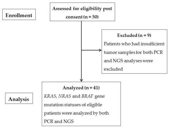 In the present study, patients with mCRC were assessed between August 2017 and June 2019 at a single institution, and 50 patients were enrolled initially. The final sample comprised 41 patients with mCRC, after 9 patients who had insufficient tumor samples for both PCR and NGS analyses were excluded. The Consolidated Standards of Reporting Trials (CONSORT) diagram is shown in Figure 1.