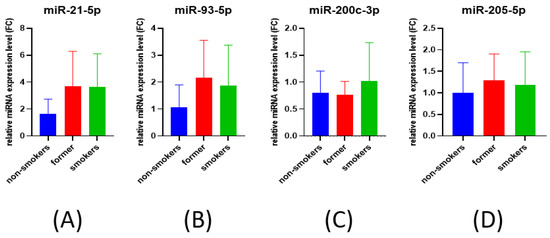 Bar plot for miRNAs expression correlated to smoking status: (A) miR-21-5p, (B) miR-93-5p, (C) miR-200c-3p, and (D) miR-205-5p.