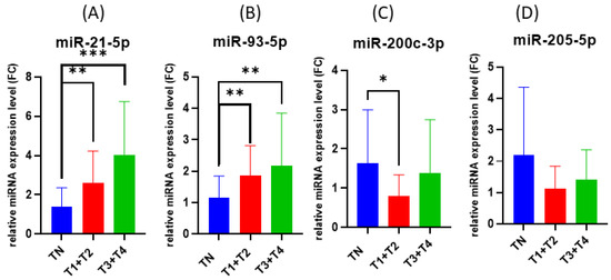 Bar plots comparing miRNAs expression of normal tissue to tumor stage: (A) miR-21-5p, (B) miR-93-5p, (C) miR-200c-3p and (D) miR-205-5p. *** < 0.001, ** < 0.01 and * < 0.05.