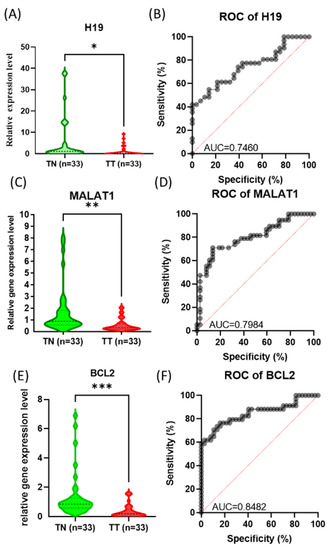 The expression level of (A) H19, (B) ROC curve for H19, (C) MALAT1 (D) ROC curve for MALAT1, (E) BCL2, and (F) ROC curve of BCL2 (*** < 0.001, ** < 0.01 and * < 0.05).