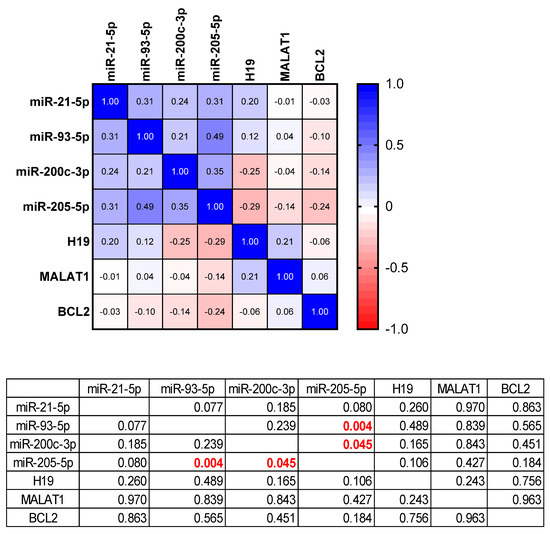 Figure 5 presents the statistical correlation between the expressions of the tested targets, miRNAs, lncRNAs and BCL2 gene. The values in red are statistically significant correlations. A direct statistically significant correlation was observed between the expression of miR-205-5p with miR-93-5p and miR-200c-3p. According to the Pearson correlation coefficient for both miRNAs we have moderate positive correlation as can be seen in Figure 5.