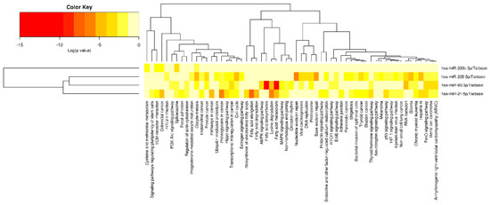 Heatmaps of significant pathways predicted by DIANA-miRPath (www.microrna.gr/miRPathv3, accessed on 10 March 2022) for miR-21-5p, miR-93-5p, miR-200c-3p, and miR-205-5p. Pathways are represented on the x-axis and miRNAs on the y-axis. The color code expresses the log (p-value), with the most relevant predicted miRNA-pathway interactions are displayed in red.