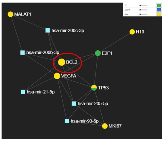 Additional miRNA-mRNA-lncRNA network generated using miRNET was done and is presented in Figure 7. BCL2 is the core of the network being targeted by three of the tested miRNAs. BCL2 is targeted directly by miR-21 a transcript having the highest expression level in oral cancer, which is in accordance with the low expression level of BCL2.