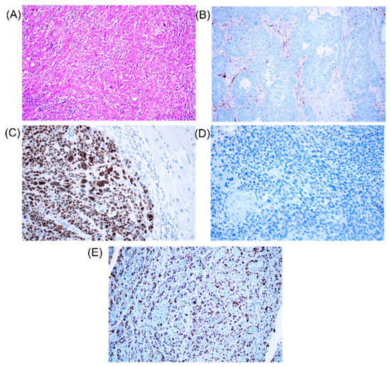 IHC staining squamous carcinoma. (A) Squamous cell carcinoma, high grade HE 200×. (B) Squamous cell carcinoma, low BCL2 expression, 400× magnification. (C) Squamous cell carcinoma, high TP53 expression, 400× magnification. (D) Squamous cell carcinoma, low TP53 expression, 400× magnification. (E) Squamous cell carcinoma, KI67 high proliferative index, 200× magnification.