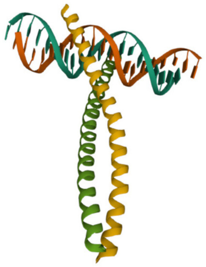 - Glover, J.N.; Harrison, S.C. Crystal structure of the heterodimeric bZIP transcription factor c-Fos-c-Jun bound to DNA. Nature 1995, 373, 257–261. [Google Scholar] [CrossRef]