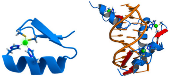 (Left) Cartoon representation of the CysHis zinc finger motif, consisting of an -helix and an antiparallel -sheet. The zinc ion (green) is coordinated by two histidine residues and two cysteine residues. (Right) Cartoon representation of the protein ZNF268 (blue) containing three zinc fingers in complex with DNA (orange). The coordinating amino acid residues and zinc ions (green) are highlighted. The name of the DNA-binding domain in the protein data bank is 4R2A.