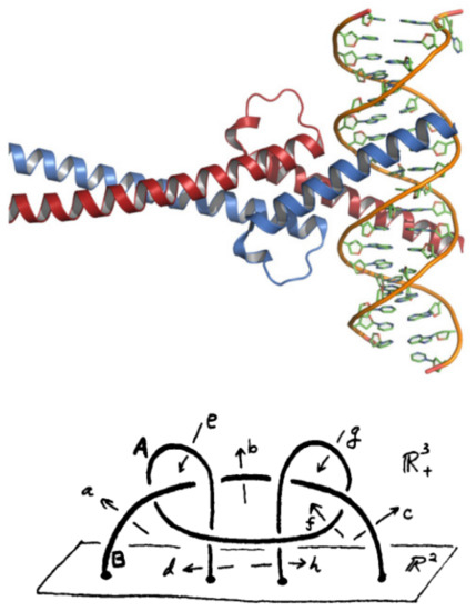 (Up) Crystal structure of Myc and Max in complex with DNA. (Down) The link (which is supposed to control the binding domain Myc) is attached to the plane in the half-space . It is not splittable. This can be proven by checking that the fundamental group is not free [22] and ([23] p. 90). One gets , where (.,.) means the group theoretical commutator. The cardinality sequence of cc of subgroups of is .