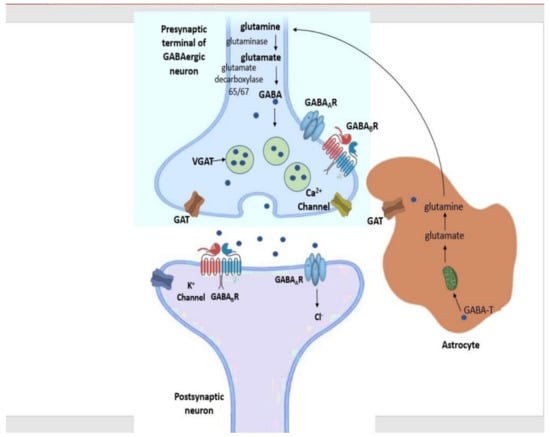 GABA synthesis (Figure 2) is initiated in the cytoplasm of the pre-synaptic GABAergic neurons by the breakdown of astrocyte-produced glutamine to glutamate via the action of the enzyme glutaminase [17]. Then, glutamate undergoes alpha-decarboxylation via the enzyme glutamic acid decarboxylase (GAD). GABA is then transferred into synaptic vesicles by the vesicular GABA transporter (vGAT) and, upon membrane depolarization, is released into the synaptic cleft [14].