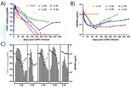 Dynamics of CAR-T and sBCMA plasma levels in the peripheral blood of patients. (A) Dynamics of CAR-T copies/μg genomic DNA in the peripheral blood. Rapid rise to high peak levels (>1.9E + 05 copies/μg), followed by decline to undetectable levels (C-85, C-89) or persistence at low levels (C-80, C-86). Rapid rise to mediocre peak levels (1.3E + 04 copies/μg) and decline to low levels (C-91). The concentration of the CAR-T copies/μg gDNA is given on a logarithmic scale on the y-axis. (B) Dynamics of sBCMA concentrations in the plasma. Rapid decline to minimal levels (C-80, C-85, C-86, C-89), followed by rebound to normal levels (C-80, C-86). Persistence of elevated levels (C-91). Response determination at the end of the study entailed three sCR (C-80, C-85, C-86), one relapsed (C-89, R), one deceased (C-91, D). The concentration of the sBCMA is given on a logarithmic scale on the y-axis. (C) Dynamics of CART copies/μg gDNA (grey bars) and sBCMA (ng/mL) in the plasma (black dots).
