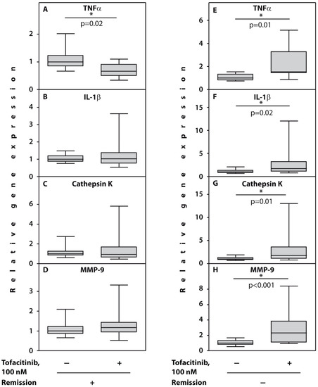 Relative gene expression in PBMCs from patients with RA prior to therapy cultured with tofacitinib during 48 h. (A–D) patients who gained remission (n = 6); (E–H) no remission (n = 6) was observed. Asterisks (*) indicate significant differences from control cells cultured without TFCN (Wilcoxon matched pairs test). Abbreviations: TNFα, tumour necrosis factor alpha; IL-1β, interleukin 1 beta; MMP-9, metalloproteinase 9.