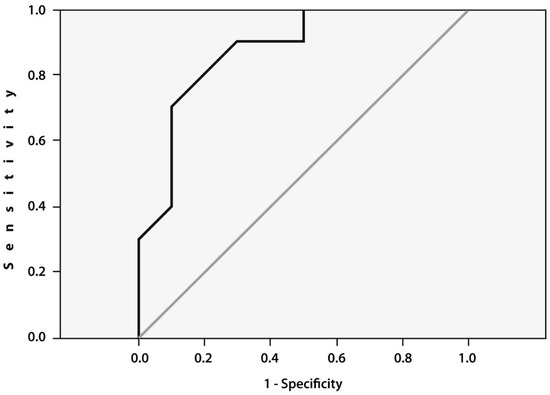 To assess the prognostic value of TNFα gene expression, we performed ROC curve analysis (Figure 2), which confirmed significant association between expression of this gene examined prior to TFCN treatment with the likelihood of remission development after therapy. The cut-off value for TNFα gene expression was 1.17 (AUC = 0.875, 95% CI (0.718–1.000), p = 0.005).