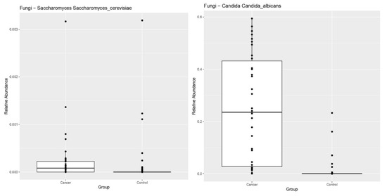 Patients with GEP-NENs had significantly decreased relative abundance of bacterial species and an increase in the relative abundance of fungi (Candida species, Ascomycota, and species belonging to saccharomycetes) compared to controls (p = 0.0013).